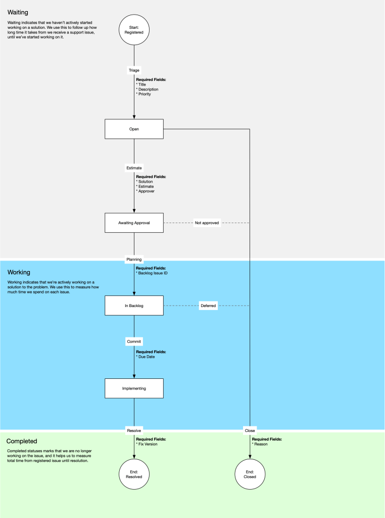 | Triage | Verify that the issue has required information and all the requirements needed for estimation.Verify that the issue doesn’t belong to another workflow. | Title, Description, Urgency, Priority |